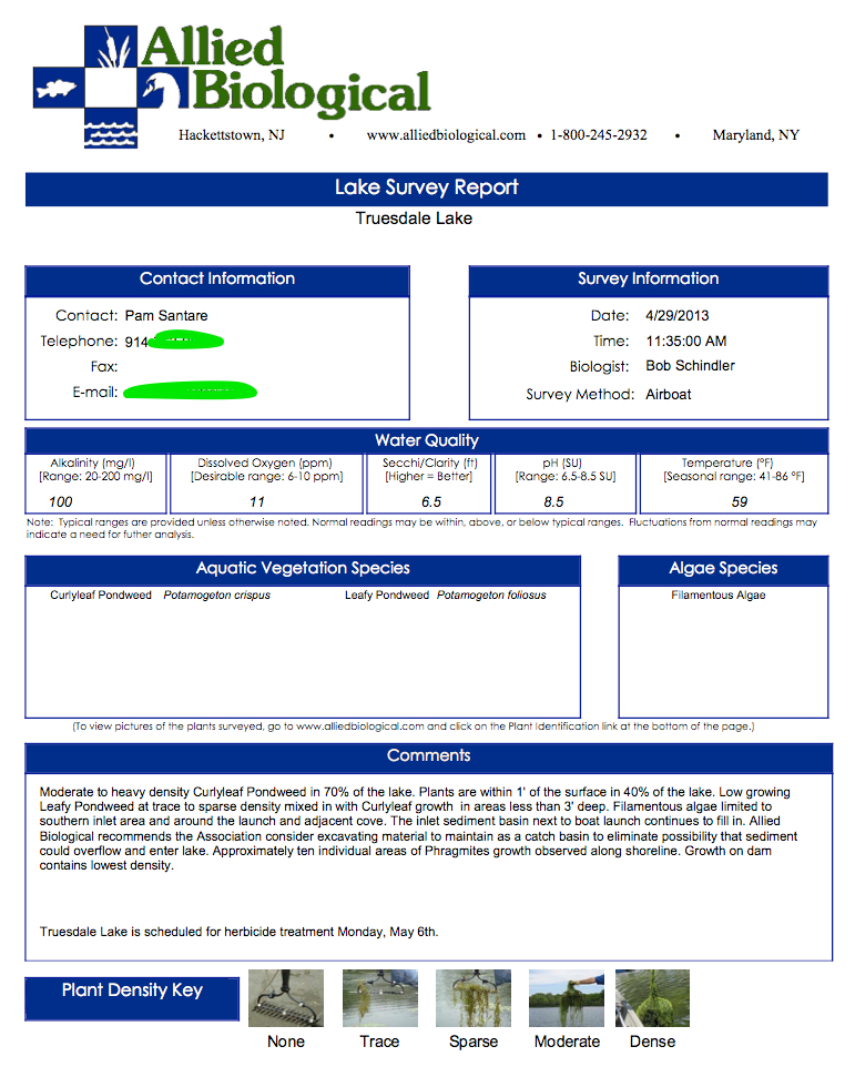 Allied Lake Survey Report – April 29, 2013 April 29, 2013 by rob April 29, 2013 Allied Biological Lake Survey Report (click for larger) Allied did a boat survey of plant and algae on the lake today. Their report is above. Click the image for a larger copy. Related Discover more from Truesdale Lake Subscribe to get the latest posts sent to your email. Type your email… Subscribe