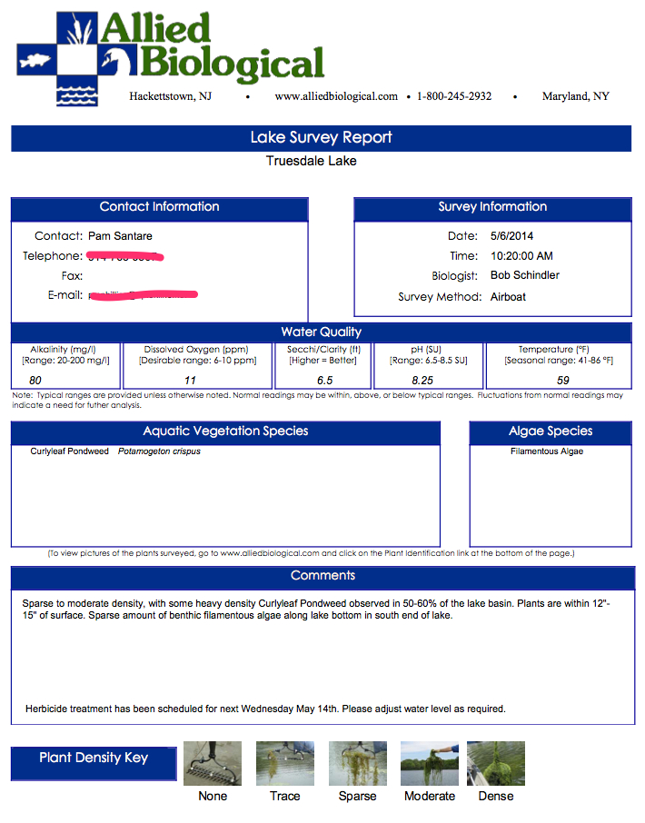 Allied Biological visited the lake yesterday to perform a plant and algae survey. Results are attached below. Click to view larger. Let us know if you have questions or comments.