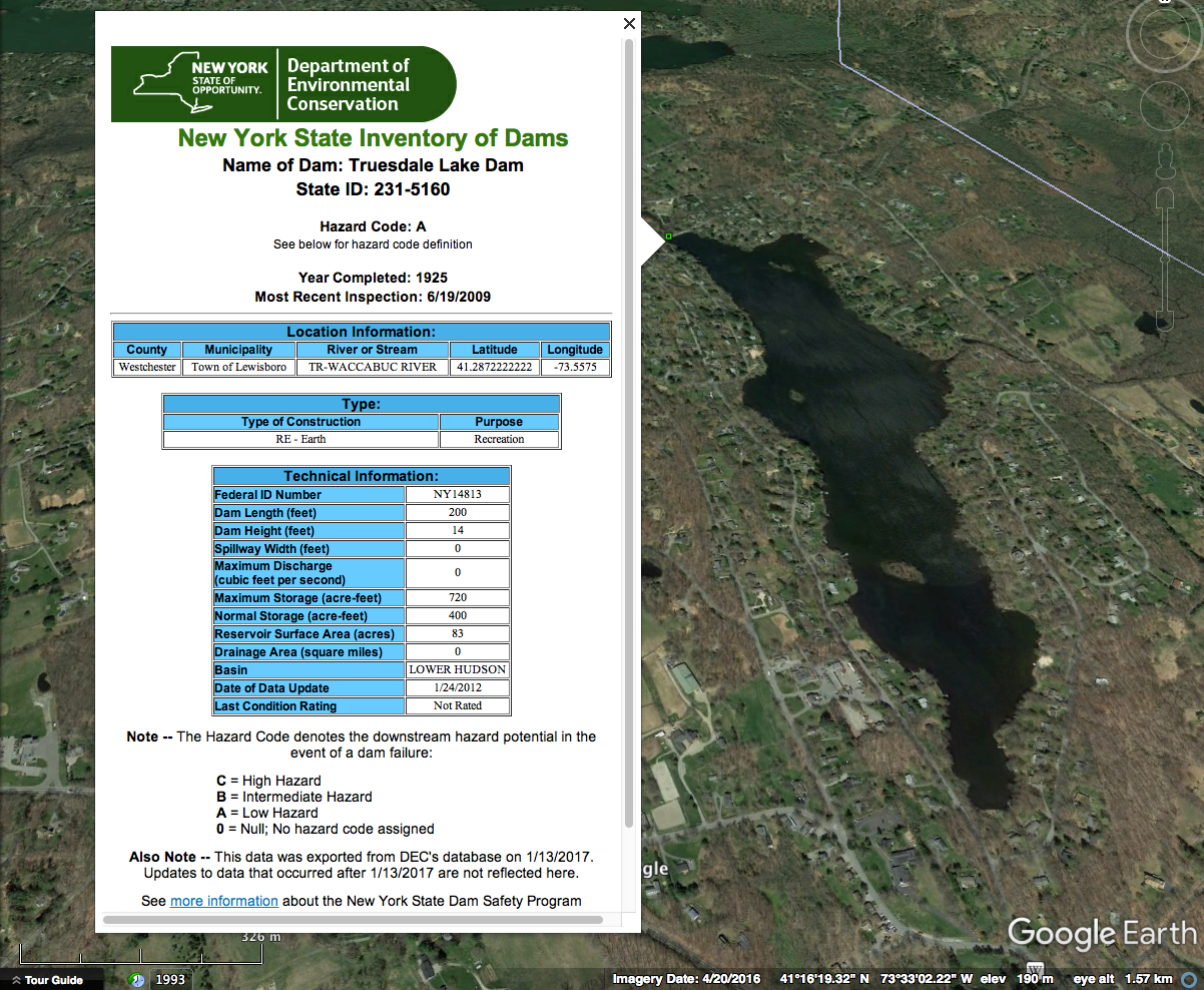 The dam is listed by the New York State Department of Environmental Conservation as a low hazard, class A dam and is built to handle the 100-year storm event.